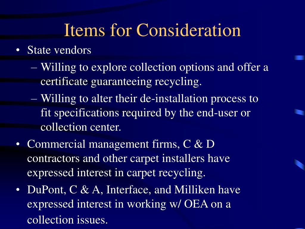 Items for Consideration • State vendors • Willing to explore collection options and offer a certificate guaranteeing recycling. • Willing to alter their de-installation process to fit specifications required by the end-user or collection center. • Commercial management firms, C & D contractors and other carpet installers have expressed interest in carpet recycling. • DuPont, C & A, Interface, and Milliken have expressed interest in working w/ OEA on a collection issues.