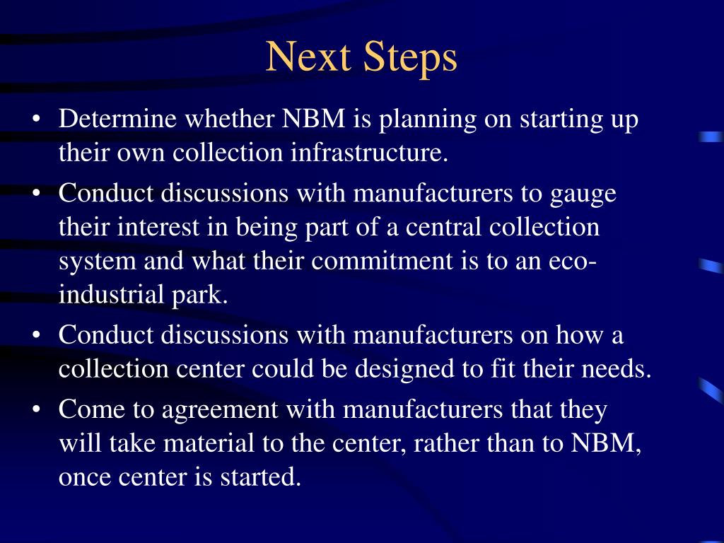 Next Steps • Determine whether NBM is planning on starting up their own collection infrastructure. • Conduct discussions with manufacturers to gauge their interest in being part of a central collection system and what their commitment is to an eco-industrial park. • Conduct discussions with manufacturers on how a collection center could be designed to fit their needs. • Come to agreement with manufacturers that they will take material to the center, rather than to NBM, once center is started.