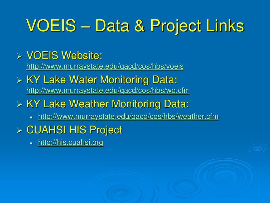 VOEIS – Data & Project Links • VOEIS Website: http://www.murraystate.edu/qacd/cos/hbs/voeis • KY Lake Water Monitoring Data: http://www.murraystate.edu/qacd/cos/hbs/wq.cfm • KY Lake Weather Monitoring Data: • http://www.murraystate.edu/qacd/cos/hbs/weather.cfm • CUAHSI HIS Project • http://his.cuahsi.org
