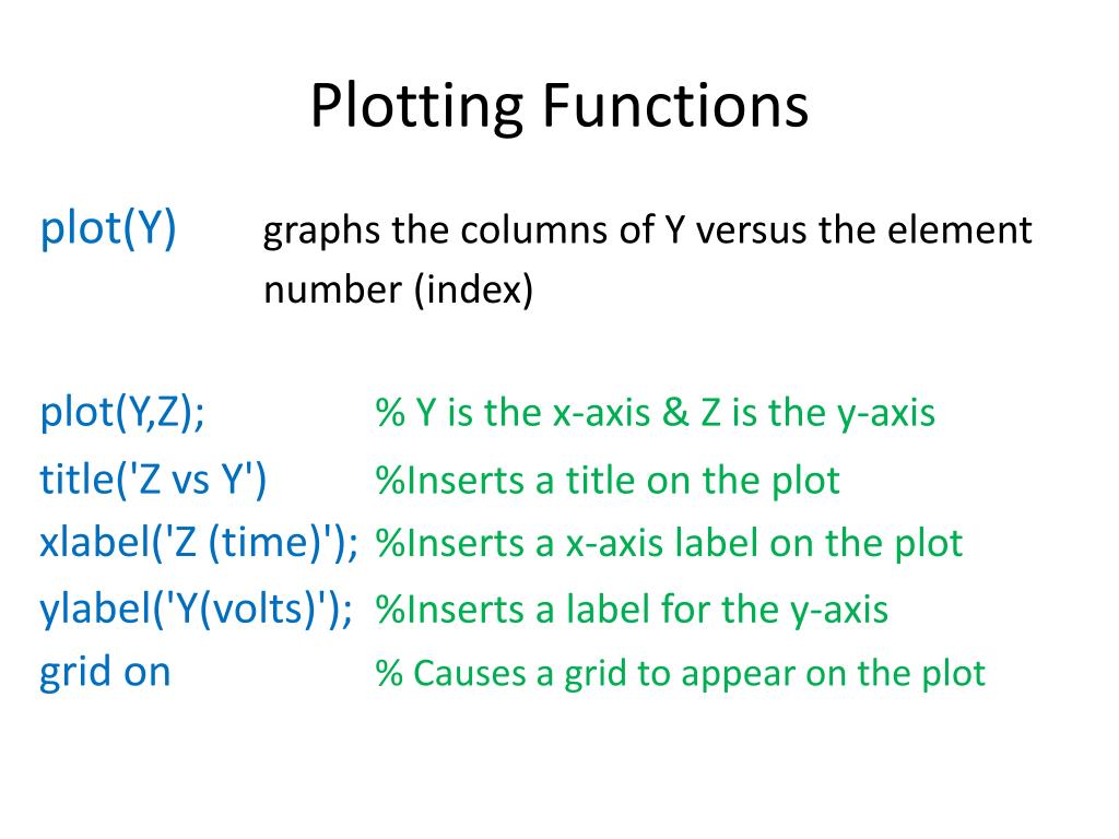 Plotting Functions plot(Y) graphs the columns of Y versus the element number (index) plot(Y,Z); % Y is the x-axis & Z is the y-axis title('Z vs Y') %Inserts a title on the plot xlabel('Z (time)'); %Inserts a x-axis label on the plot ylabel('Y(volts)');%Inserts a label for the y-axis grid on % Causes a grid to appear on the plot