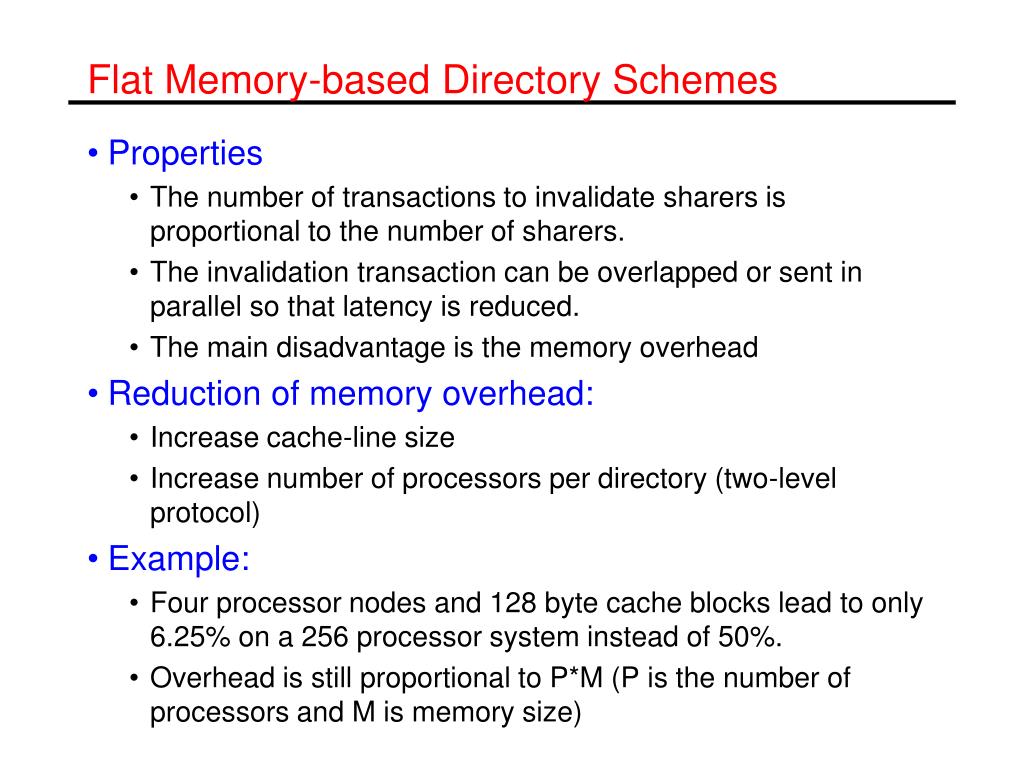 Flat Memory-based Directory Schemes • Properties • The number of transactions to invalidate sharers is proportional to the number of sharers. • The invalidation transaction can be overlapped or sent in parallel so that latency is reduced. • The main disadvantage is the memory overhead • Reduction of memory overhead: • Increase cache-line size • Increase number of processors per directory (two-level protocol) • Example: • Four processor nodes and 128 byte cache blocks lead to only 6.25% on a 256 processor system instead of 50%. • Overhead is still proportional to P*M (P is the number of processors and M is memory size)