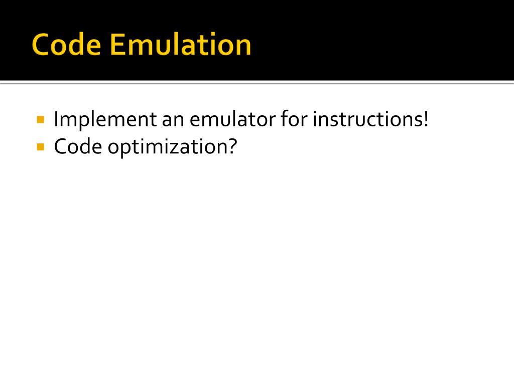 Code Emulation • Implement an emulator for instructions! • Code optimization?