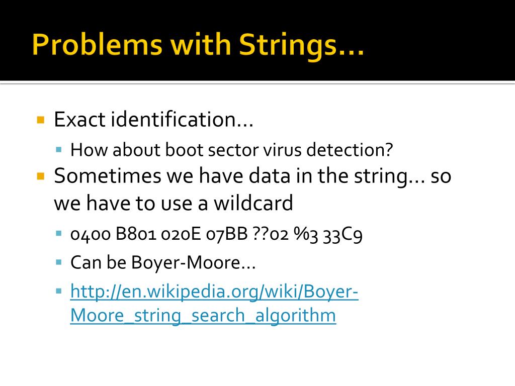Problems with Strings… • Exact identification… • How about boot sector virus detection? • Sometimes we have data in the string… so we have to use a wildcard • 0400 B801 020E 07BB ??02 %3 33C9 • Can be Boyer-Moore… • http://en.wikipedia.org/wiki/Boyer-Moore_string_search_algorithm