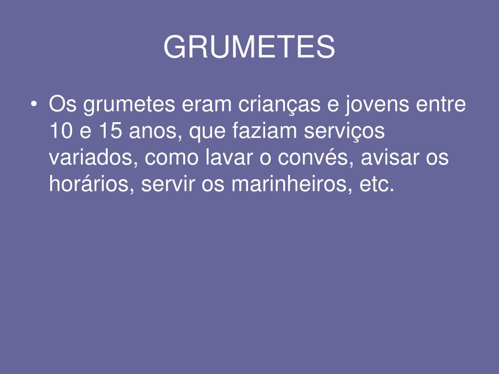 GRUMETES • Os grumetes eram crianças e jovens entre 10 e 15 anos, que faziam serviços variados, como lavar o convés, avisar os horários, servir os marinheiros, etc.
