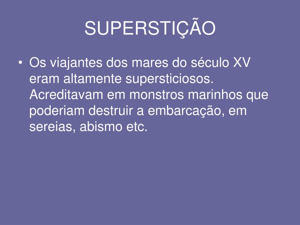 SUPERSTIÇÃO • Os viajantes dos mares do século XV eram altamente supersticiosos. Acreditavam em monstros marinhos que poderiam destruir a embarcação, em sereias, abismo etc.