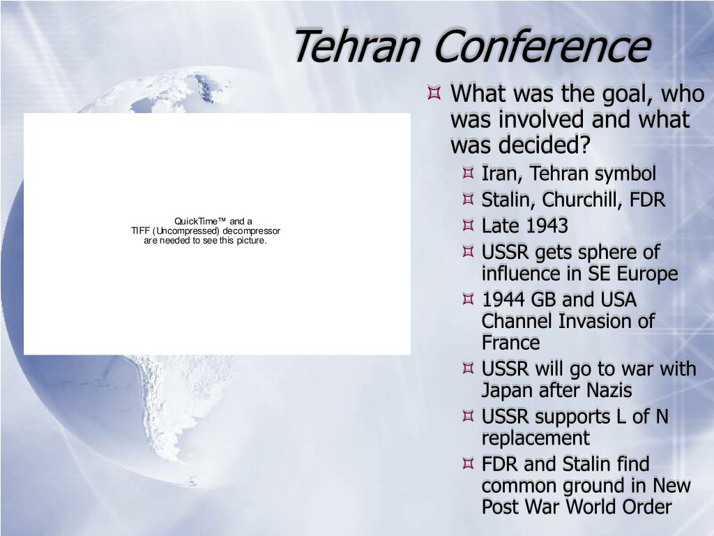Tehran Conference • What was the goal, who was involved and what was decided? • Iran, Tehran symbol • Stalin, Churchill, FDR • Late 1943 • USSR gets sphere of influence in SE Europe • 1944 GB and USA Channel Invasion of France • USSR will go to war with Japan after Nazis • USSR supports L of N replacement • FDR and Stalin find common ground in New Post War World Order