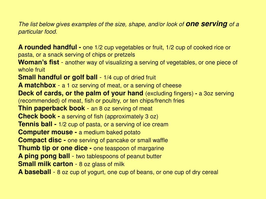 The list below gives examples of the size, shape, and/or look of one serving of a particular food. A rounded handful -one 1/2 cup vegetables or fruit, 1/2 cup of cooked rice or pasta, or a snack serving of chips or pretzels Woman’s fist - another way of visualizing a serving of vegetables, or one piece of whole fruit Small handful or golf ball - 1/4 cup of dried fruit A matchbox - a 1 oz serving of meat, or a serving of cheese Deck of cards, or the palm of your hand (excluding fingers) - a 3oz serving (recommended) of meat, fish or poultry, or ten chips/french fries Thin paperback book - an 8 oz serving of meat Check book -a serving of fish (approximately 3 oz) Tennis ball -1/2 cup of pasta, or a serving of ice cream Computer mouse -a medium baked potato Compact disc -one serving of pancake or small waffle Thumb tip or one dice -one teaspoon of margarine A ping pong ball - two tablespoons of peanut butter Small milk carton - 8 oz glass of milk A baseball - 8 oz cup of yogurt, one cup of beans, or one cup of dry cereal