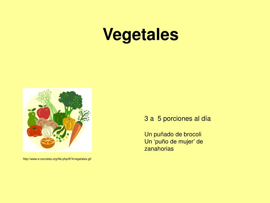 Vegetales 3 a 5 porciones al día Un puñado de brocoli Un ‘puño de mujer’ de zanahorias http://www.e-socrates.org/file.php/874/vegetales.gif