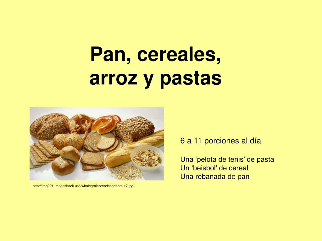 Pan, cereales, arroz y pastas 6 a 11 porciones al día Una ‘pelota de tenis’ de pasta Un ‘beisbol’ de cereal Una rebanada de pan http://img221.imageshack.us/i/wholegrainbreadsandcereut7.jpg/