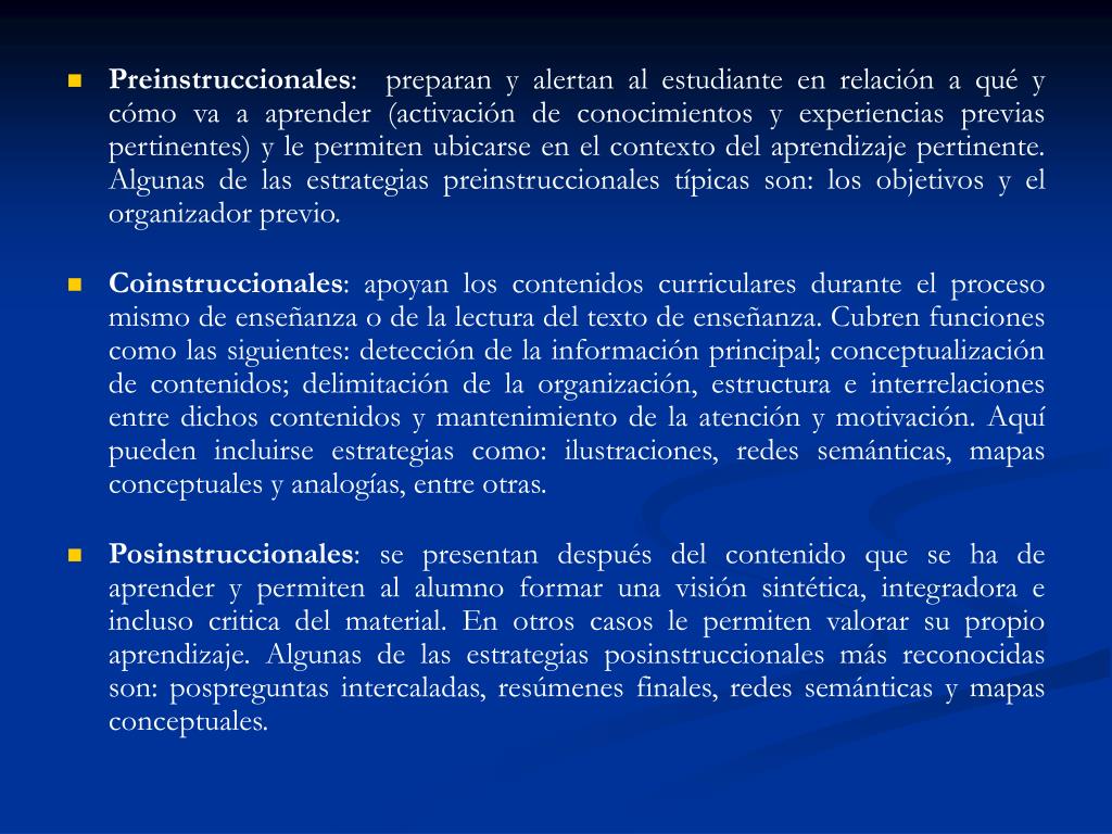 Preinstruccionales: preparan y alertan al estudiante en relación a qué y cómo va a aprender (activación de conocimientos y experiencias previas pertinentes) y le permiten ubicarse en el contexto del aprendizaje pertinente. Algunas de las estrategias preinstruccionales típicas son: los objetivos y el organizador previo. • Coinstruccionales: apoyan los contenidos curriculares durante el proceso mismo de enseñanza o de la lectura del texto de enseñanza. Cubren funciones como las siguientes: detección de la información principal; conceptualización de contenidos; delimitación de la organización, estructura e interrelaciones entre dichos contenidos y mantenimiento de la atención y motivación. Aquí pueden incluirse estrategias como: ilustraciones, redes semánticas, mapas conceptuales y analogías, entre otras. • Posinstruccionales: se presentan después del contenido que se ha de aprender y permiten al alumno formar una visión sintética, integradora e incluso critica del material. En otros casos le permiten valorar su propio aprendizaje. Algunas de las estrategias posinstruccionales más reconocidas son: pospreguntas intercaladas, resúmenes finales, redes semánticas y mapas conceptuales.