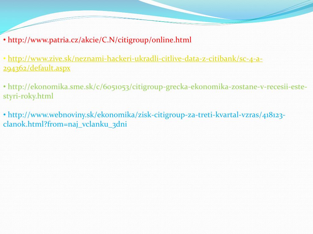 http://www.patria.cz/akcie/C.N/citigroup/online.html • http://www.zive.sk/neznami-hackeri-ukradli-citlive-data-z-citibank/sc-4-a-294362/default.aspx • http://ekonomika.sme.sk/c/6051053/citigroup-grecka-ekonomika-zostane-v-recesii-este-styri-roky.html • http://www.webnoviny.sk/ekonomika/zisk-citigroup-za-treti-kvartal-vzras/418123-clanok.html?from=naj_vclanku_3dni