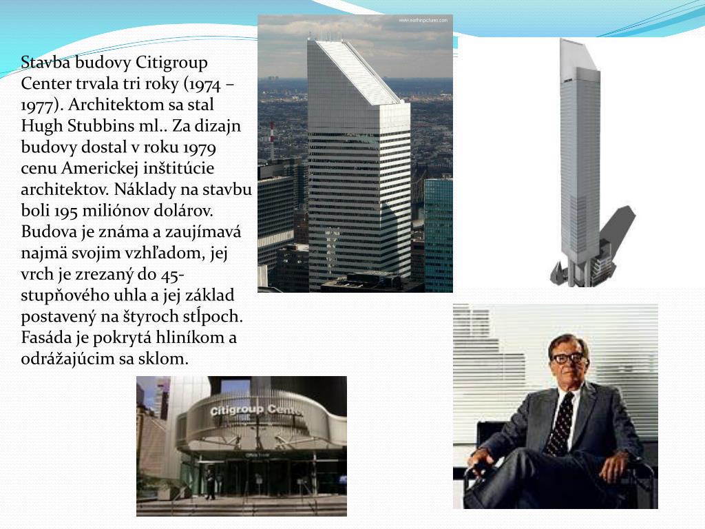 Citigroup Center • Citigroup Center (kedysi Citicorp Center) je jeden z najvyšších mrakodrapov v New Yorku. Budova je situovaná na Lexington Avenue medzi 53. a 54. ulicou v Midtown Manhattane. 59-poschodový mrakodrap s výškou 279 metrov navrhol architekt HughStubbins mladší pre banku Citibank. S výstavbou sa začalo v roku 1974 a dokončená bola v roku 1977.