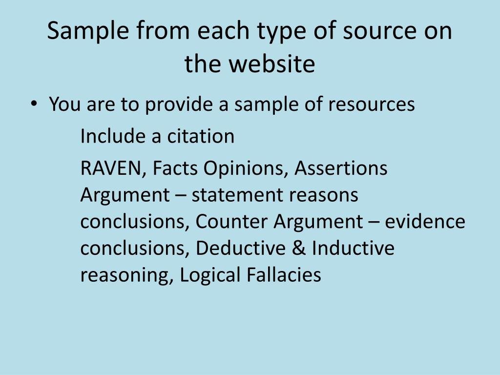 Sample from each type of source on the website • You are to provide a sample of resources Include a citation RAVEN, Facts Opinions, Assertions Argument – statement reasons conclusions, Counter Argument – evidence conclusions, Deductive & Inductive reasoning, Logical Fallacies
