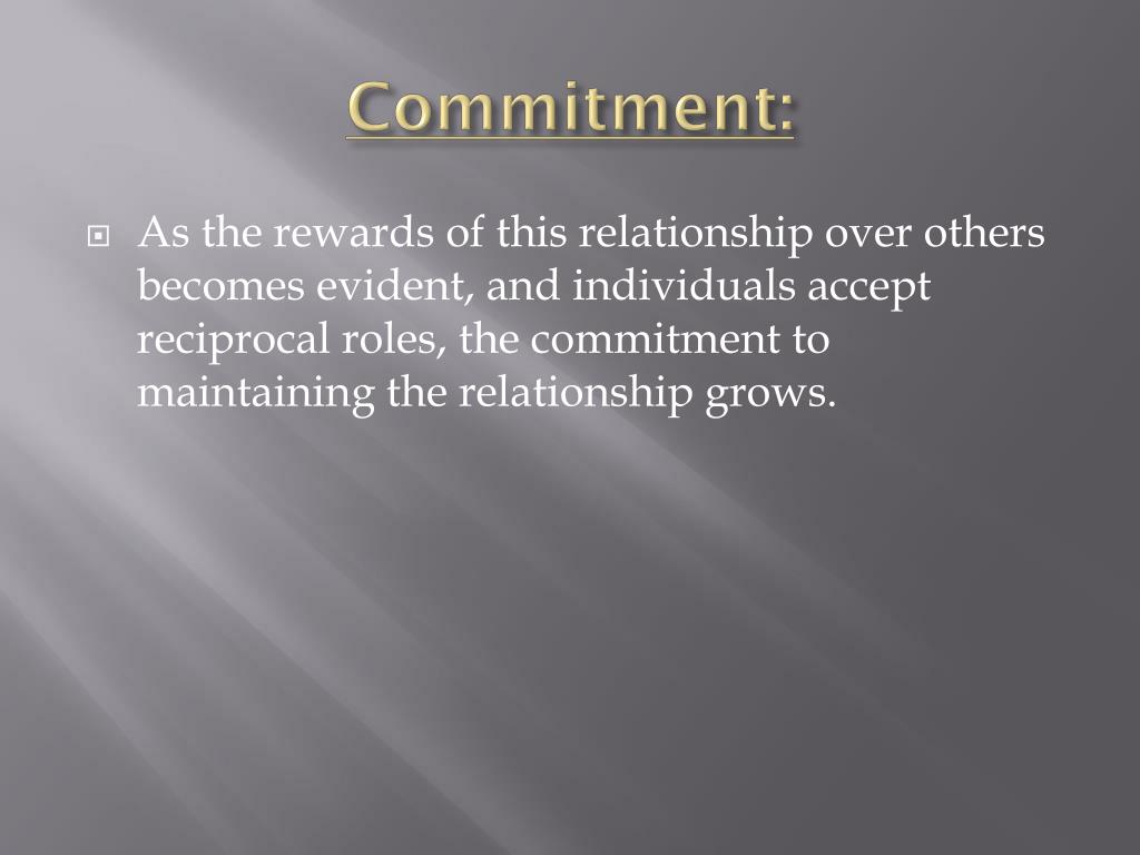 Commitment: • As the rewards of this relationship over others becomes evident, and individuals accept reciprocal roles, the commitment to maintaining the relationship grows.