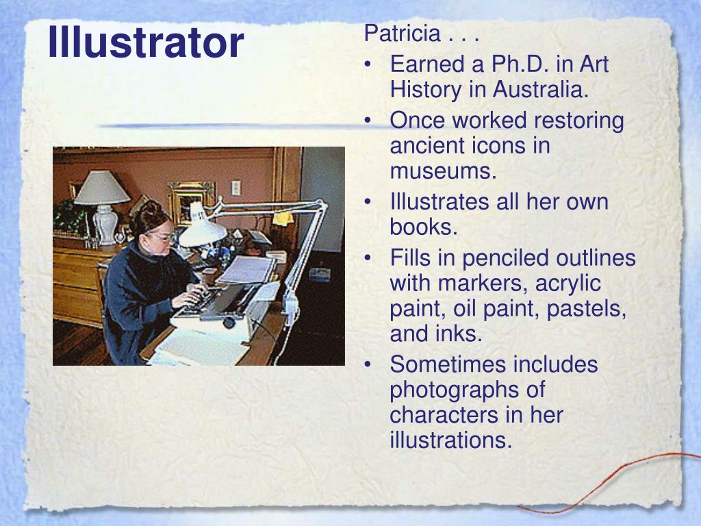 Illustrator Patricia . . . • Earned a Ph.D. in Art History in Australia. • Once worked restoring ancient icons in museums. • Illustrates all her own books. • Fills in penciled outlines with markers, acrylic paint, oil paint, pastels, and inks. • Sometimes includes photographs of characters in her illustrations.