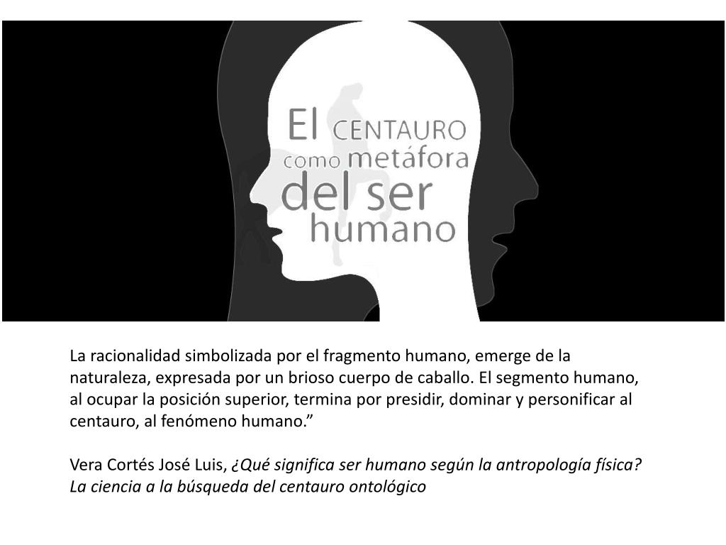 La racionalidad simbolizada por el fragmento humano, emerge de la naturaleza, expresada por un brioso cuerpo de caballo. El segmento humano, al ocupar la posición superior, termina por presidir, dominar y personificar al centauro, al fenómeno humano.” Vera Cortés José Luis, ¿Qué significa ser humano según la antropología física? La ciencia a la búsqueda del centauro ontológico