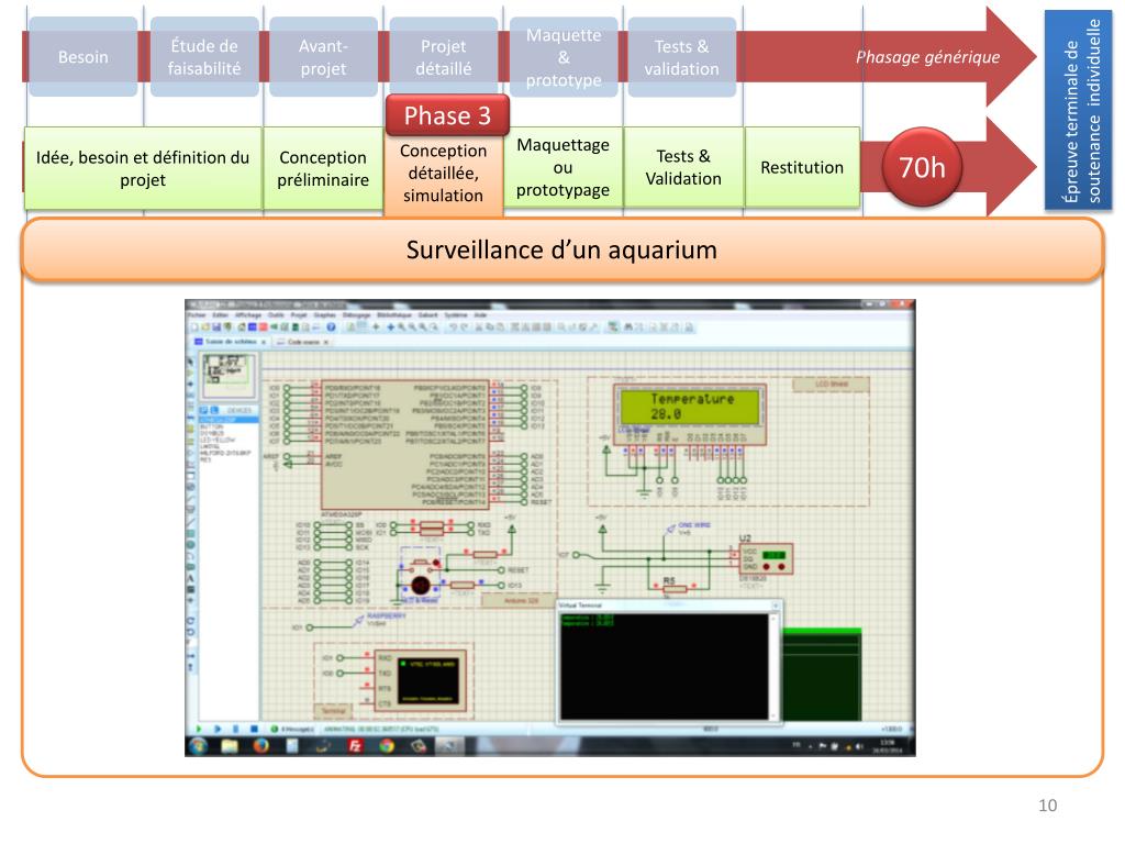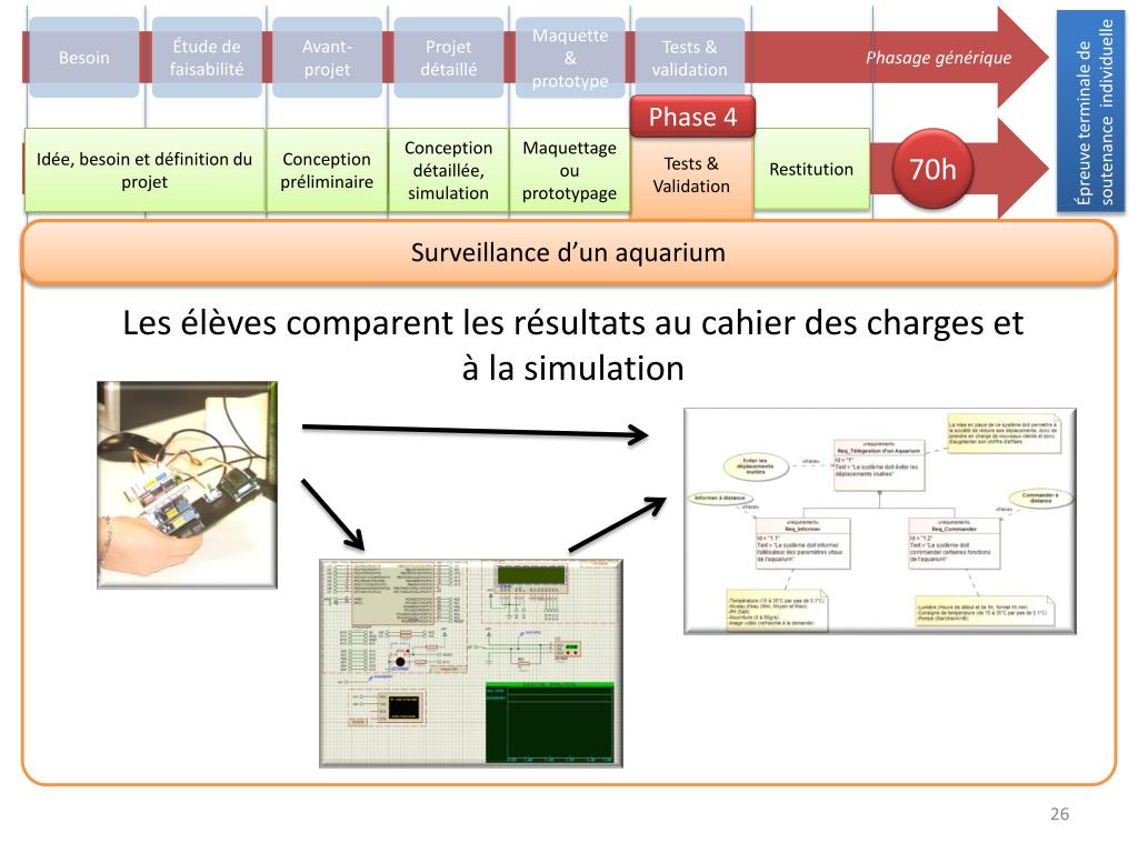 Phasage générique Épreuve terminale de soutenance individuelle Besoin Étude de faisabilité Avant-projet Projet détaillé Maquette & prototype Tests & validation Phase 3 Idée, besoin et définition du projet Maquettage ou prototypage 70h Conception préliminaire Conception détaillée, simulation Tests & Validation Restitution Surveillance d’un aquarium les élèves travaillent sur la mise au point du programme de la commande de lumière et de l’acquisition de la température.