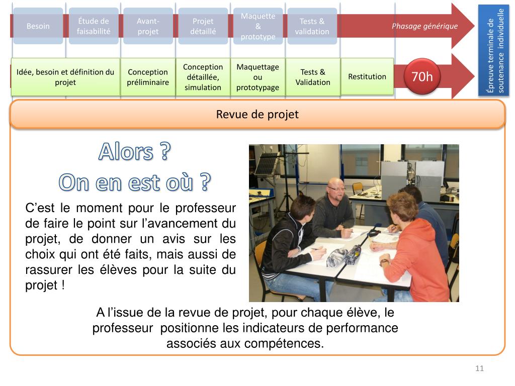 Phasage générique Épreuve terminale de soutenance individuelle Besoin Étude de faisabilité Avant-projet Projet détaillé Maquette & prototype Tests & validation Idée, besoin et définition du projet 70h Conception préliminaire Conception détaillée, simulation Maquettage ou prototypage Tests & Validation Restitution Revue de projet Alors ? On en est où ? C’est le moment pour le professeur de faire le point sur l’avancement du projet, de donner un avis sur les choix qui ont été faits, mais aussi de rassurer les élèves pour la suite du projet ! A l’issue de la revue de projet, pour chaque élève, le professeur positionne les indicateurs de performance associés aux compétences.