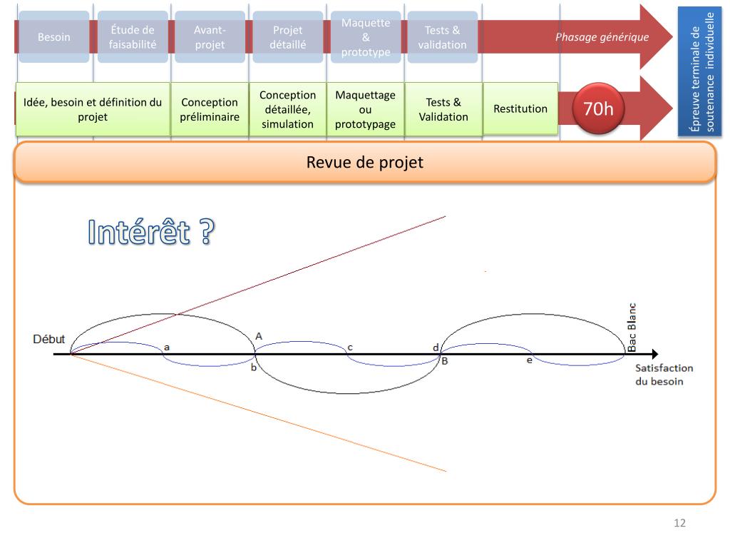 Phasage générique Épreuve terminale de soutenance individuelle Besoin Étude de faisabilité Avant-projet Projet détaillé Maquette & prototype Tests & validation Idée, besoin et définition du projet 70h Conception préliminaire Conception détaillée, simulation Maquettage ou prototypage Tests & Validation Restitution Revue de projet Intérêt ?