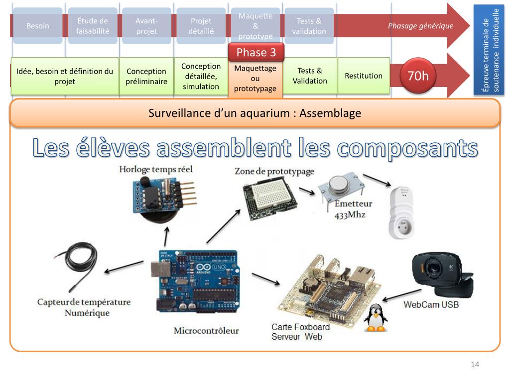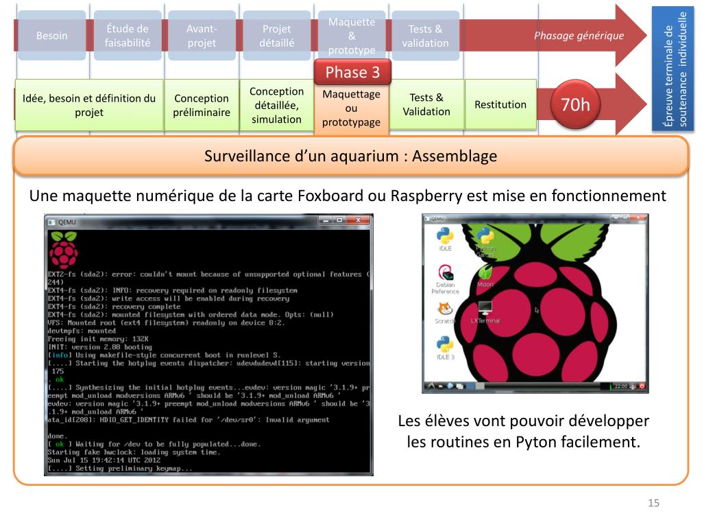 Phasage générique Épreuve terminale de soutenance individuelle Besoin Étude de faisabilité Avant-projet Projet détaillé Maquette & prototype Tests & validation Phase 3 Idée, besoin et définition du projet Maquettage ou prototypage 70h Conception préliminaire Conception détaillée, simulation Tests & Validation Restitution Surveillance d’un aquarium : Assemblage Une maquette numérique de la carte Foxboard ou Raspberry est mise en fonctionnement Les élèves vont pouvoir développer les routines en Pyton facilement.