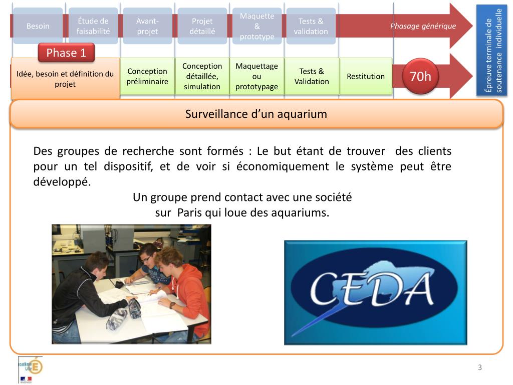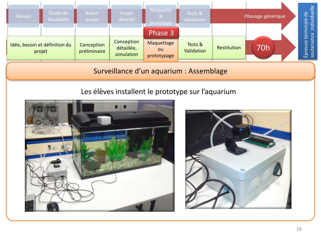 Phasage générique Épreuve terminale de soutenance individuelle Besoin Étude de faisabilité Avant-projet Projet détaillé Maquette & prototype Tests & validation Phase 3 Idée, besoin et définition du projet Maquettage ou prototypage 70h Conception préliminaire Conception détaillée, simulation Tests & Validation Restitution Surveillance d’un aquarium : Installation de l’aquarium Afin de travailler dans les conditions réelles, les élèves installent un aquarium !