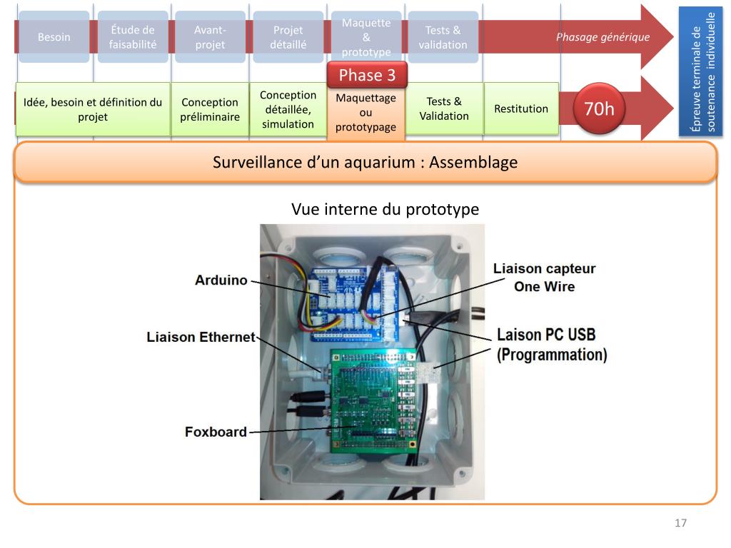 Phasage générique Épreuve terminale de soutenance individuelle Besoin Étude de faisabilité Avant-projet Projet détaillé Maquette & prototype Tests & validation Phase 3 Idée, besoin et définition du projet Maquettage ou prototypage 70h Conception préliminaire Conception détaillée, simulation Tests & Validation Restitution Surveillance d’un aquarium : Assemblage Vue interne du prototype