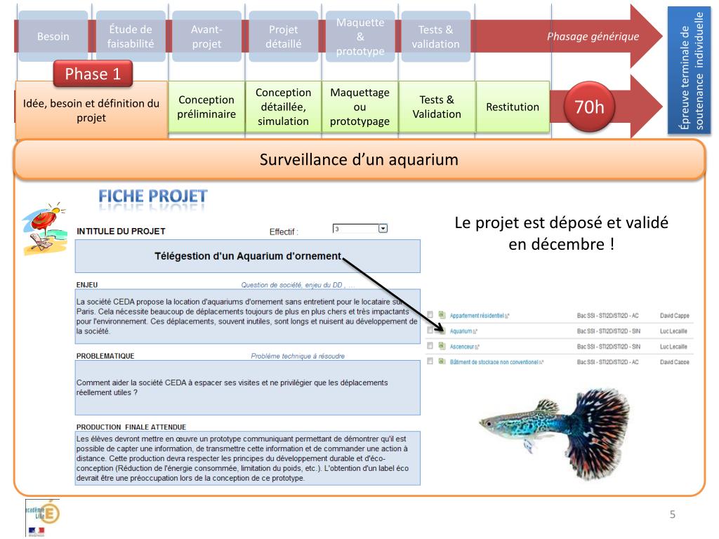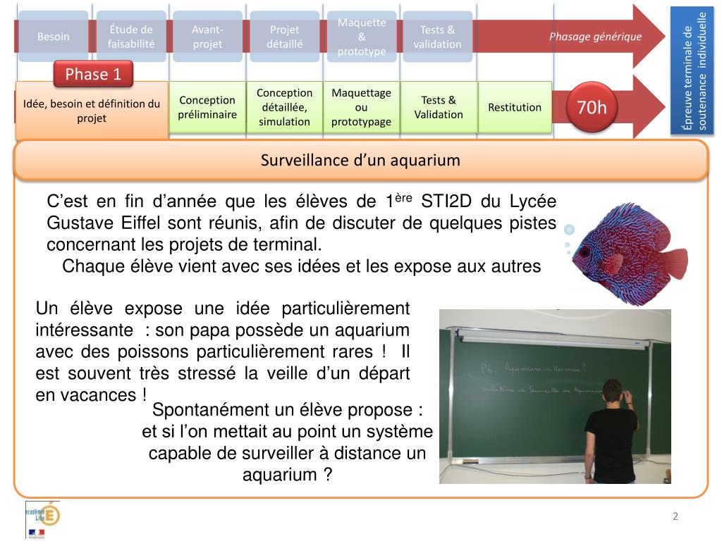 Phasage générique Épreuve terminale de soutenance individuelle Besoin Étude de faisabilité Avant-projet Projet détaillé Maquette & prototype Tests & validation Phase 1 Idée, besoin et définition du projet 70h Conception préliminaire Conception détaillée, simulation Maquettage ou prototypage Tests & Validation Restitution Surveillance d’un aquarium C’est en fin d’année que les élèves de 1ère STI2D du Lycée Gustave Eiffel sont réunis, afin de discuter de quelques pistes concernant les projets de terminal. Chaque élève vient avec ses idées et les expose aux autres Un élève expose une idée particulièrement intéressante : son papa possède un aquarium avec des poissons particulièrement rares ! Il est souvent très stressé la veille d’un départ en vacances ! Spontanément un élève propose : et si l’on mettait au point un système capable de surveiller à distance un aquarium ?
