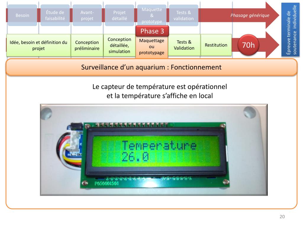 Phasage générique Épreuve terminale de soutenance individuelle Besoin Étude de faisabilité Avant-projet Projet détaillé Maquette & prototype Tests & validation Phase 3 Idée, besoin et définition du projet Maquettage ou prototypage 70h Conception préliminaire Conception détaillée, simulation Tests & Validation Restitution Surveillance d’un aquarium : Fonctionnement Le capteur de température est opérationnel et la température s’affiche en local