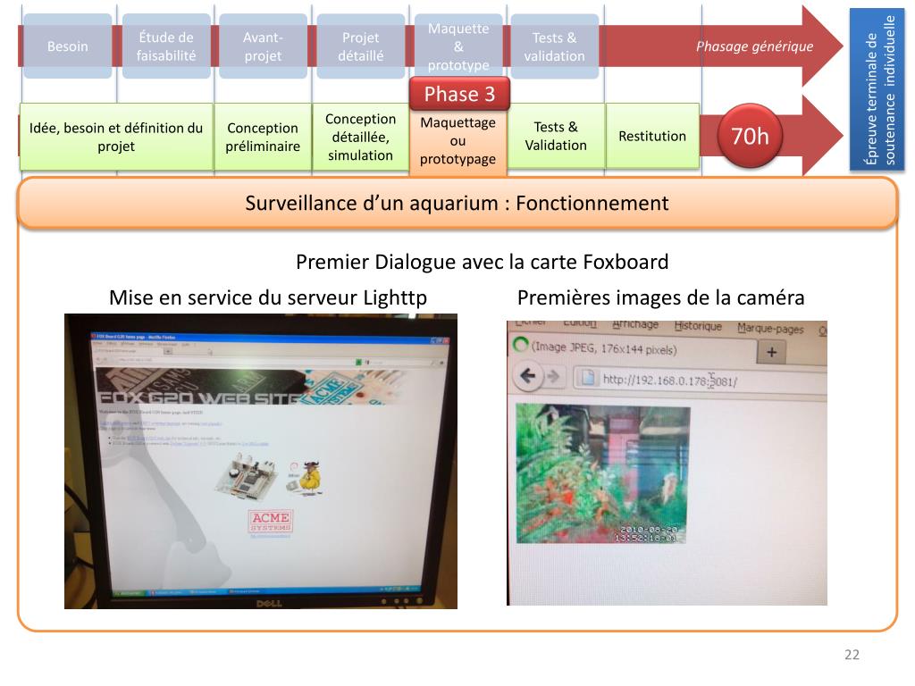 Phasage générique Épreuve terminale de soutenance individuelle Besoin Étude de faisabilité Avant-projet Projet détaillé Maquette & prototype Tests & validation Phase 3 Idée, besoin et définition du projet Maquettage ou prototypage 70h Conception préliminaire Conception détaillée, simulation Tests & Validation Restitution Surveillance d’un aquarium : Fonctionnement Premier Dialogue avec la carte Foxboard Mise en service du serveur Lighttp Premières images de la caméra
