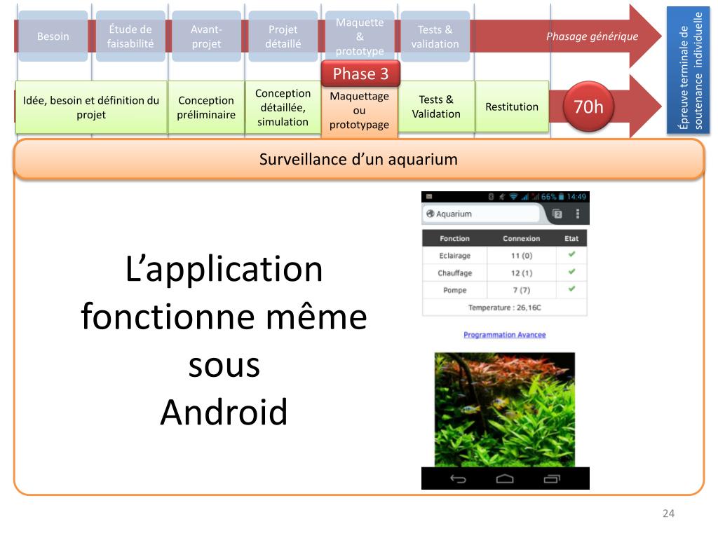 Phasage générique Épreuve terminale de soutenance individuelle Besoin Étude de faisabilité Avant-projet Projet détaillé Maquette & prototype Tests & validation Phase 3 Idée, besoin et définition du projet Maquettage ou prototypage 70h Conception préliminaire Conception détaillée, simulation Tests & Validation Restitution Surveillance d’un aquarium L’application fonctionne même sous Android