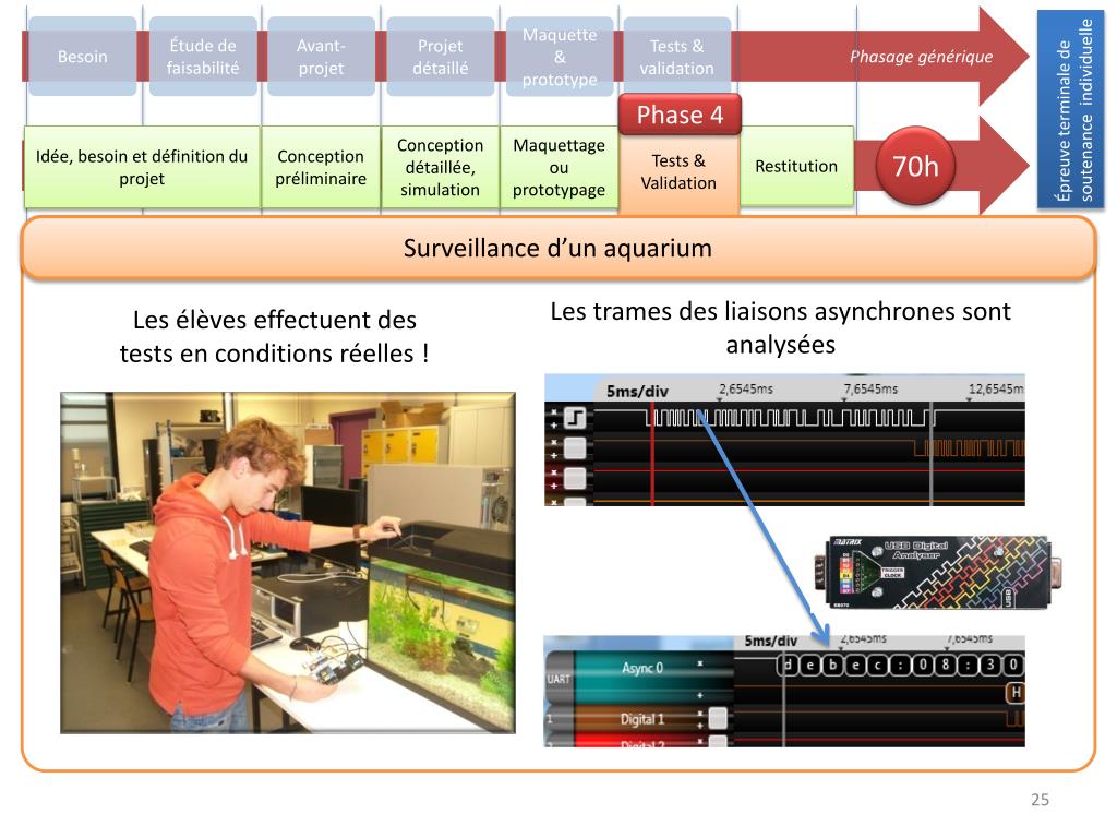 Phasage générique Épreuve terminale de soutenance individuelle Besoin Étude de faisabilité Avant-projet Projet détaillé Maquette & prototype Tests & validation Phase 4 Idée, besoin et définition du projet 70h Conception préliminaire Conception détaillée, simulation Maquettage ou prototypage Tests & Validation Restitution Surveillance d’un aquarium Les trames des liaisons asynchrones sont analysées Les élèves effectuent des tests en conditions réelles !