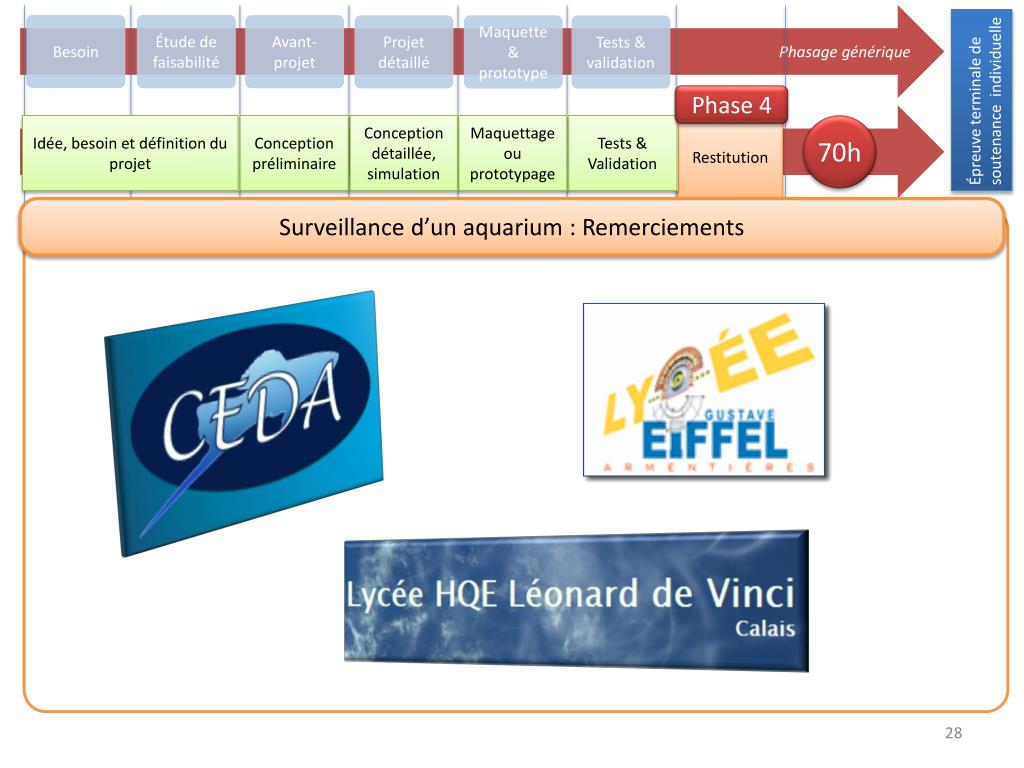 Phasage générique Épreuve terminale de soutenance individuelle Besoin Étude de faisabilité Avant-projet Projet détaillé Maquette & prototype Tests & validation Phase 4 Idée, besoin et définition du projet 70h Conception préliminaire Conception détaillée, simulation Maquettage ou prototypage Tests & Validation Restitution Surveillance d’un aquarium : Remerciements