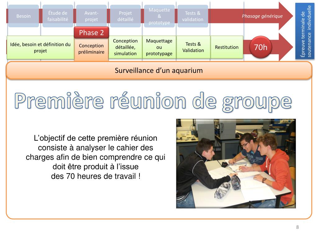 Phasage générique Épreuve terminale de soutenance individuelle Besoin Étude de faisabilité Avant-projet Projet détaillé Maquette & prototype Tests & validation Phase 2 Idée, besoin et définition du projet Conception préliminaire 70h Conception détaillée, simulation Maquettage ou prototypage Tests & Validation Restitution Surveillance d’un aquarium Première réunion de groupe L’objectif de cette première réunion consiste à analyser le cahier des charges afin de bien comprendre ce qui doit être produit à l’issue des 70 heures de travail !