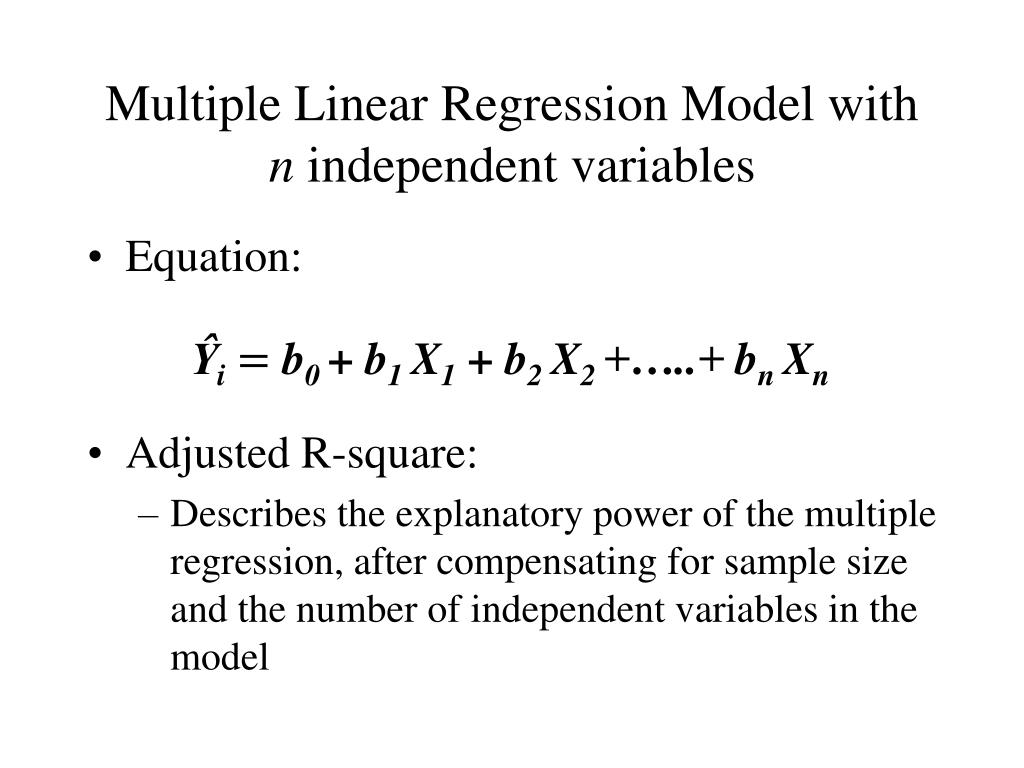 Multiple Linear Regression Model with n independent variables • Equation: • Adjusted R-square: • Describes the explanatory power of the multiple regression, after compensating for sample size and the number of independent variables in the model Ŷi b0 + b1 X1 + b2 X2 +…..+ bnXn