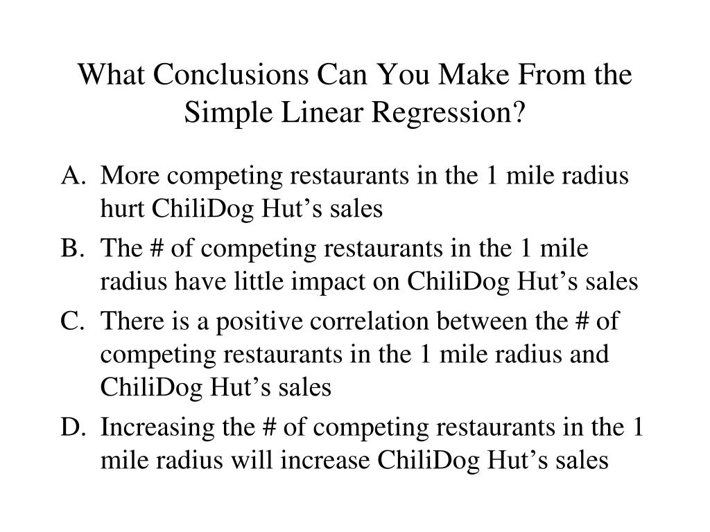 What Conclusions Can You Make From the Simple Linear Regression? • More competing restaurants in the 1 mile radius hurt ChiliDog Hut’s sales • The # of competing restaurants in the 1 mile radius have little impact on ChiliDog Hut’s sales • There is a positive correlation between the # of competing restaurants in the 1 mile radius and ChiliDog Hut’s sales • Increasing the # of competing restaurants in the 1 mile radius will increase ChiliDog Hut’s sales