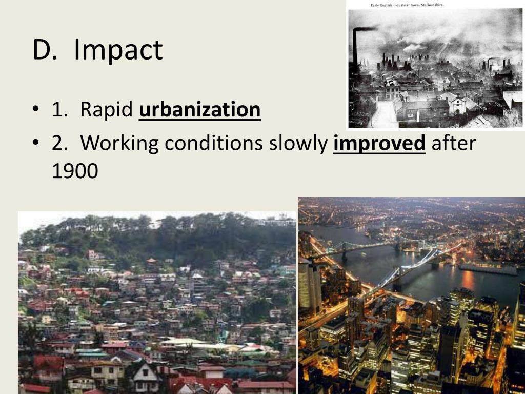 D. Impact • 1. Rapid urbanization • 2. Working conditions slowly improved after 1900