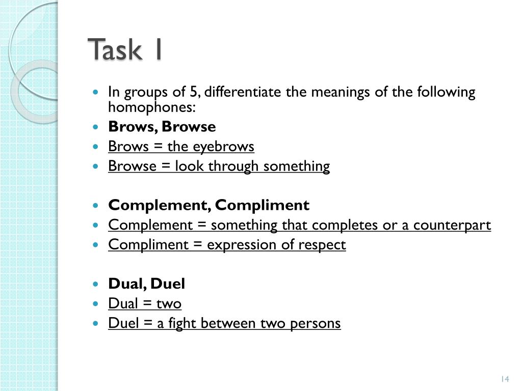Task 1 • In groups of 5, differentiate the meanings of the following homophones: • Brows, Browse • Brows = the eyebrows • Browse = look through something • Complement, Compliment • Complement = something that completes or a counterpart • Compliment = expression of respect • Dual, Duel • Dual = two • Duel = a fight between two persons