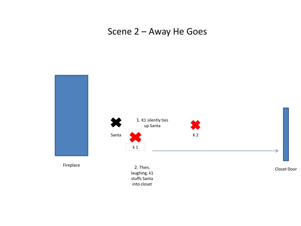 Scene 2 – Away He Goes 1. K1 silently ties up Santa Santa K 2 k 1 Fireplace Closet Door 2. Then, laughing, k1 stuffs Santa into closet