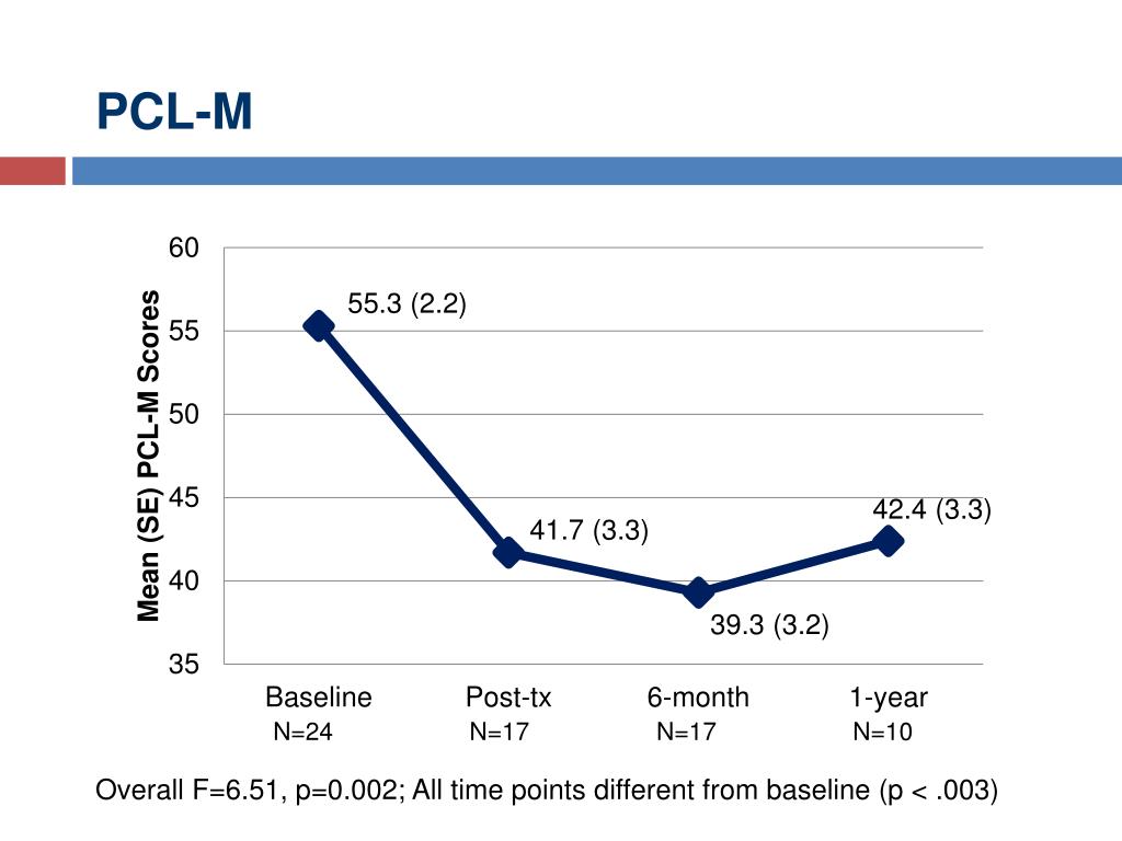 PCL-M N=24 N=17 N=17 N=10 Overall F=6.51, p=0.002; All time points different from baseline (p < .003)