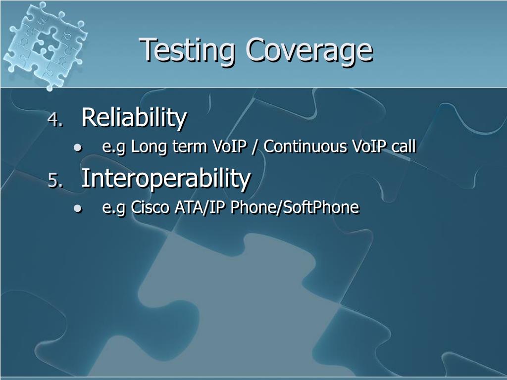 Testing Coverage • Reliability • e.g Long term VoIP / Continuous VoIP call • Interoperability • e.g Cisco ATA/IP Phone/SoftPhone