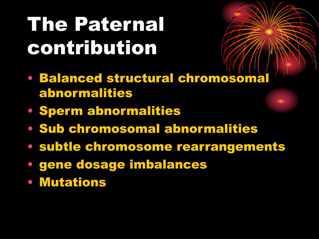 The Paternal contribution • Balanced structural chromosomal abnormalities • Sperm abnormalities • Sub chromosomal abnormalities • subtle chromosome rearrangements • gene dosage imbalances • Mutations