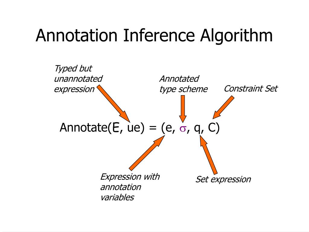 Typed but unannotated expression Annotated type scheme Constraint Set Expression with annotation variables Set expression Annotation Inference Algorithm Annotate(E, ue) = (e, s, q, C)