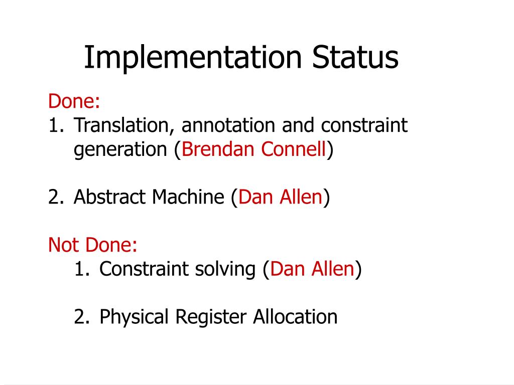 Implementation Status • Done: • Translation, annotation and constraint generation (Brendan Connell) • Abstract Machine (Dan Allen) • Not Done: • Constraint solving (Dan Allen) • Physical Register Allocation
