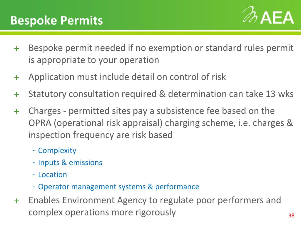 Bespoke Permits • Bespoke permit needed if no exemption or standard rules permit is appropriate to your operation • Application must include detail on control of risk • Statutory consultation required & determination can take 13 wks • Charges - permitted sites pay a subsistence fee based on the OPRA (operational risk appraisal) charging scheme, i.e. charges & inspection frequency are risk based • Complexity • Inputs & emissions • Location • Operator management systems & performance • Enables Environment Agency to regulate poor performers and complex operations more rigorously