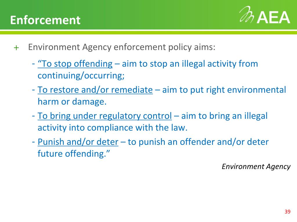 Enforcement • Environment Agency enforcement policy aims: • “To stop offending – aim to stop an illegal activity from continuing/occurring; • To restore and/or remediate – aim to put right environmental harm or damage. • To bring under regulatory control – aim to bring an illegal activity into compliance with the law. • Punish and/or deter – to punish an offender and/or deter future offending.” Environment Agency
