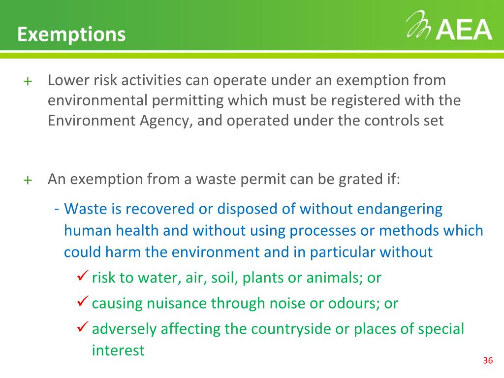 Exemptions • Lower risk activities can operate under an exemption from environmental permitting which must be registered with the Environment Agency, and operated under the controls set • An exemption from a waste permit can be grated if: • Waste is recovered or disposed of without endangering human health and without using processes or methods which could harm the environment and in particular without • risk to water, air, soil, plants or animals; or • causing nuisance through noise or odours; or • adversely affecting the countryside or places of special interest
