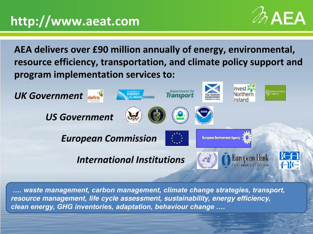 http://www.aeat.com AEA delivers over £90 million annually of energy, environmental, resource efficiency, transportation, and climate policy support and program implementation services to: UK Government US Government European Commission International Institutions …. waste management, carbon management, climate change strategies, transport, resource management, life cycle assessment, sustainability, energy efficiency, clean energy, GHG inventories, adaptation, behaviour change ….