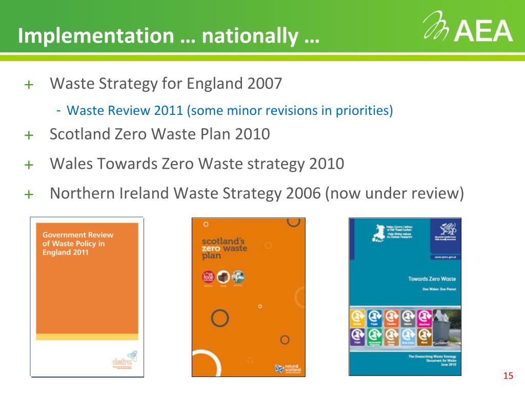 Implementation … nationally … • Waste Strategy for England 2007 • Waste Review 2011 (some minor revisions in priorities) • Scotland Zero Waste Plan 2010 • Wales Towards Zero Waste strategy 2010 • Northern Ireland Waste Strategy 2006 (now under review)