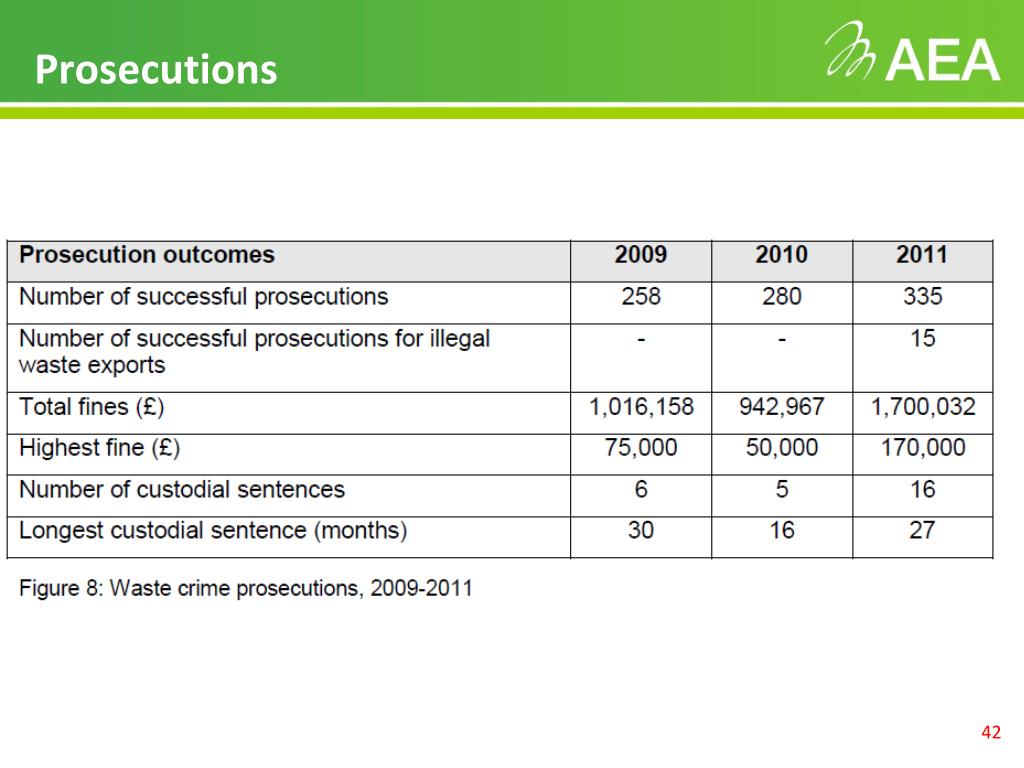Proceeds of Crime Act • Allows a Court to deprive convicted offenders of assets gained from crime. But can only be used following a guilty verdict • EA can: • Ensure environmental crime does not continue • Investigate finances to establish and find hidden profits • Stop the disposal of assets whilst investigations is underway • Present evidence to court for a confiscation order – i.e. how much the offender has to pay. Failure to pay – prison sentence • Remove profits, even if offender serves a jail sentence • Confiscations in 2011: • Number of on-going financial investigations: 132 • Number of confiscation orders: 26 • Total confiscated: £2.2m • Highest confiscation: £0.9m