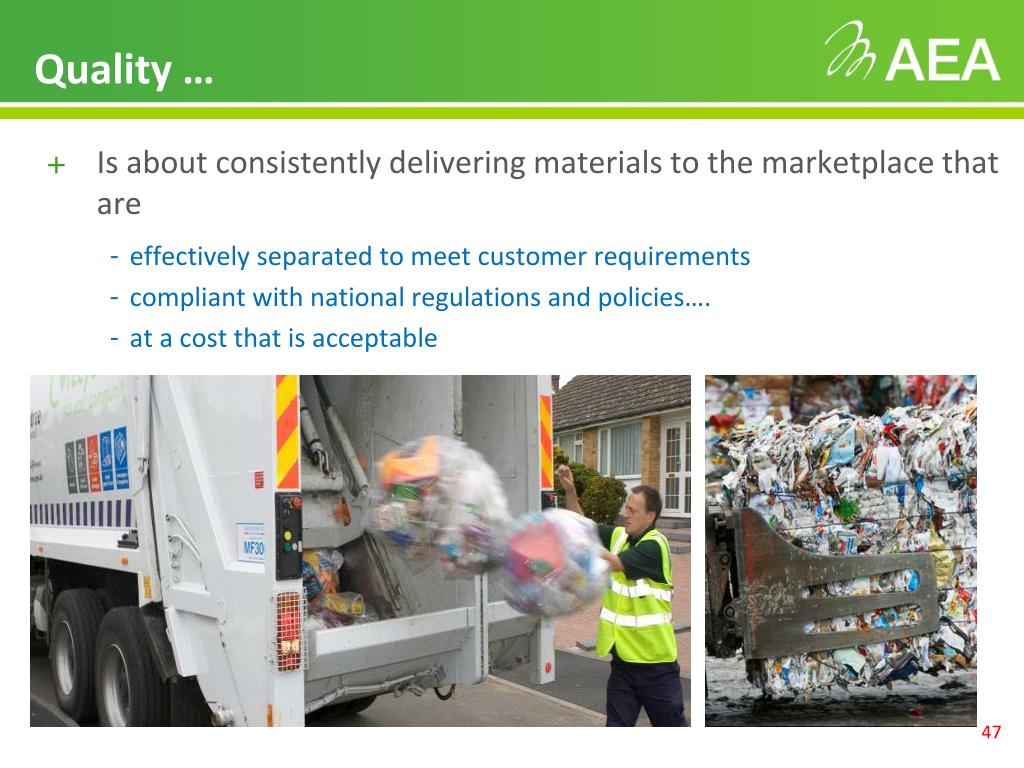 Quality … • Is about consistently delivering materials to the marketplace that are • effectively separated to meet customer requirements • compliant with national regulations and policies…. • at a cost that is acceptable